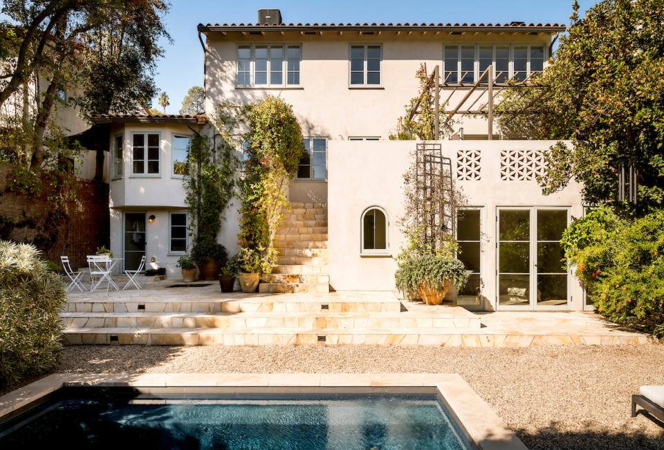 Just moments from the Reservoir, this exquisitely renovated 1933 Monterey Colonial home offers 4 bedrooms and 4 bathrooms, masterfully blending modern design with timeless warmth and charm. A true private compound, the property is fully hedged and fenced for ultimate privacy. Step through the front gate and into a romantic courtyard garden with a trickling antique fountain, an enchanting secret oasis that feels worlds away, reminiscent of the South of France. Designed for effortless indoor/outdoor living, French doors from the kitchen and dining room open to the garden, while a covered second-floor balcony overlooks the serene grounds. The flat backyard is an entertainer’s dream, featuring a stunning pool, patio, and fountain, perfect for dining al fresco or soaking in the sun. Inside, the home is a designer’s work of art, showcasing a Bulthaup kitchen, plaster walls, vintage ironwork, California Faucets, Merit hardware, marble terrazzo, and exposed beam ceilings. Every window is custom-made by TM Cobb, complementing the high-end appliance suite that includes a Miele refrigerator and dishwasher, Wolf oven and cooktop, center island, and a coffee station that tucks away out of sight. The generous primary suite offers a luxurious retreat with vaulted ceilings, dual walk-in closets, and a breathtaking spa-like ensuite bathroom finished in marble terrazzo and tadelakt plaster. Modern comforts include solar power and a Life Source whole-home water filtration system, combining sustainability and wellness with classic architectural beauty. Ideally located in the Ivanhoe Elementary school district and moments from Silver Lake favorites like L & E Oyster Bar, Bar Siesta, La Mill Coffee, and the Silver Lake Reservoir, this property is a rare architectural gem in one of Los Angeles’s most sought-after neighborhoods. Constructed with mindful craftsmanship and intention, crystals were placed throughout during renovation to promote clarity, calm, and connection, creating a sanctuary that nurtures serenity and peace. Fireplace is decorative. On title this home is 2 bed, 3 bath, but shows as 4 bed, 4 bath. Square footage on title is 2,397, but is 2,925 as taped.